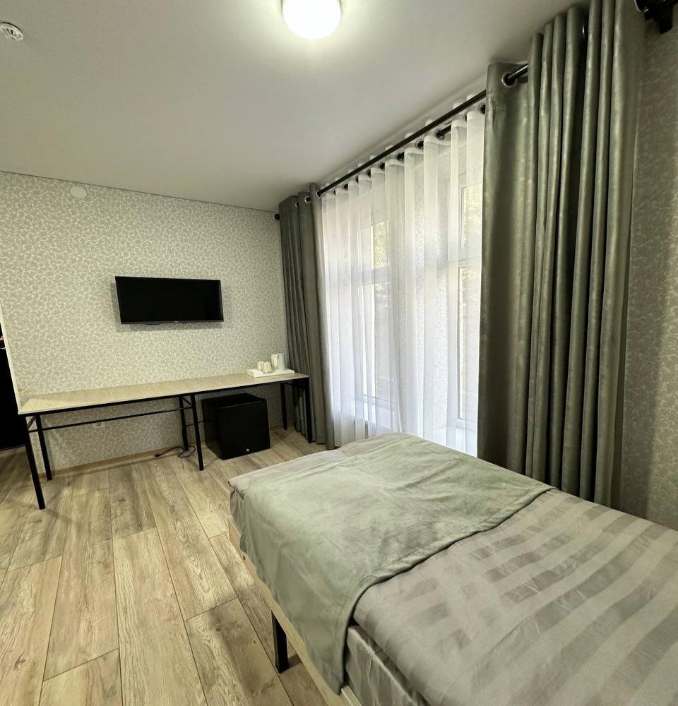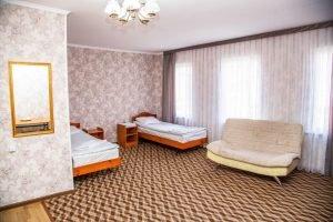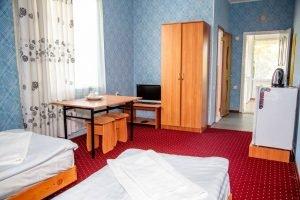 1 комн. 2х и 3х местные номера. Спальня + гостиная. В номерах: спальная мебель, холод-к, диван. ТВ. Душ. Туалет. Возможны 2 доп места.