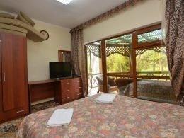 1-комнатный. В номере: сан узел, душ, ТВ, холод-к,чайник, балкон или терраса, ротанговая мебель: диван, два кресла, стол.