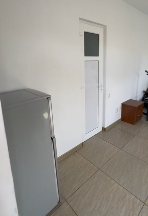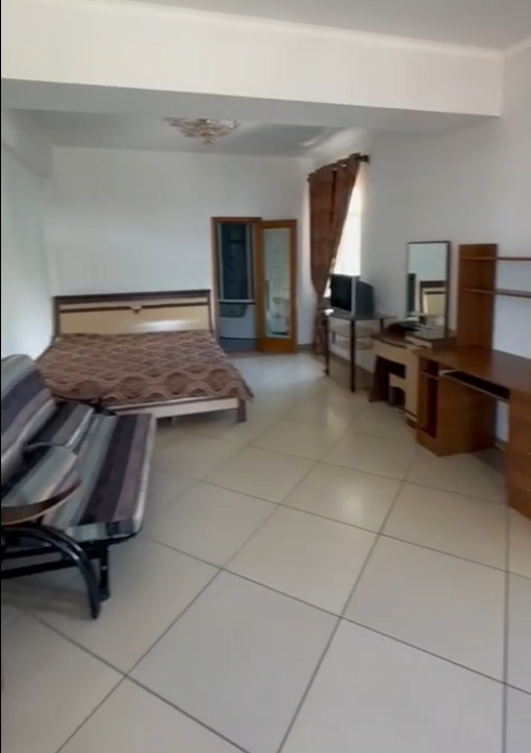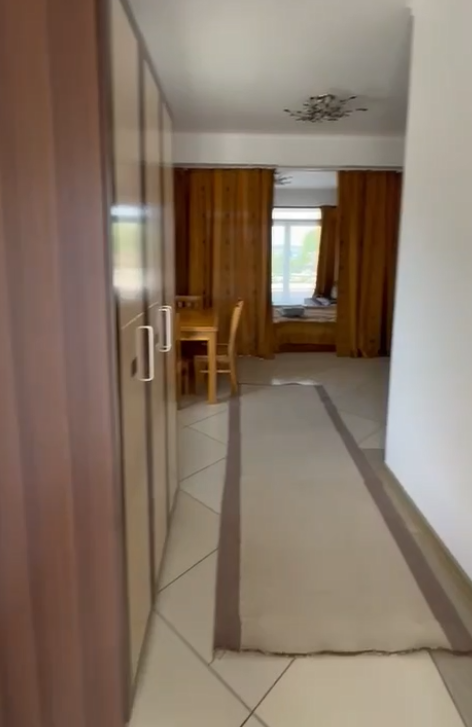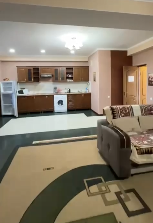 Просторный зал совмещенный с кухней ( кухня полностью оборудована). В зале диваны, телевизор, кухонный уголок, холодильник, обеденный стол, шкаф, отдельный сан. узел