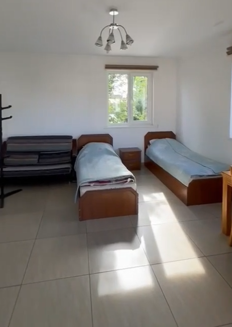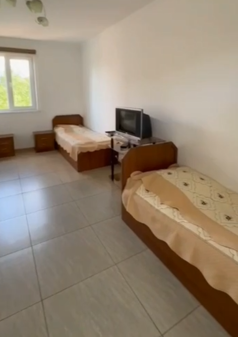 1 комната - двуспальная и две односпальные кровати, телевизор, шкаф, тумба