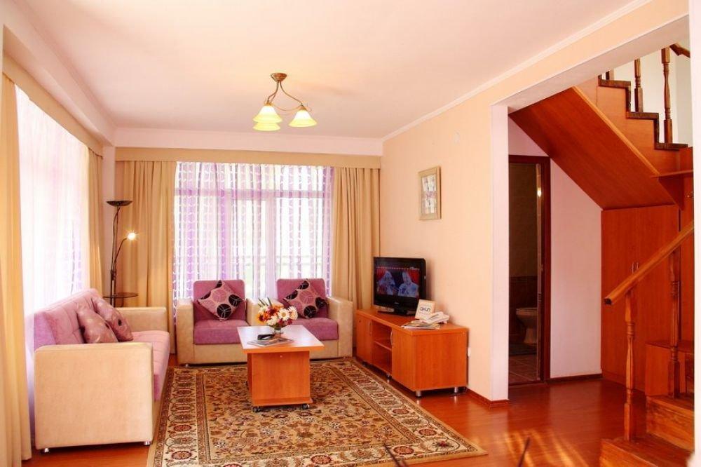 На втором этаже расположена одна спальная комната с двуспальной кроватью или двумя односпальными кроватями. В комнате есть мягкая мебель и телевизор. На первом этаже сан.узел с ванной и гостиная комната с двумя односпальными кроватями, столовым уголком и телевизором.