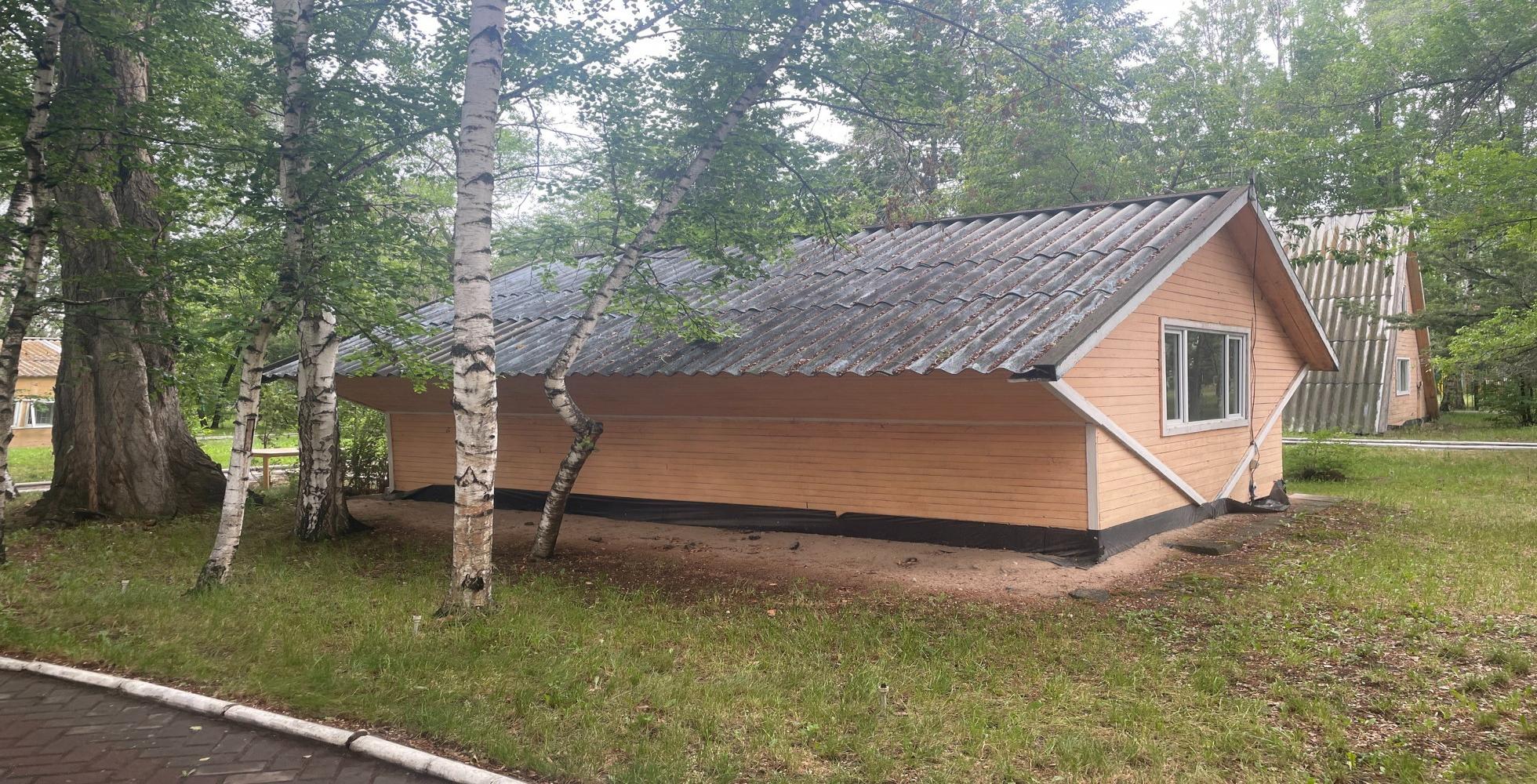 Домик формы «ромб», рассчитан на 4 человека. Состоит из двух комнат: большой холл и одна спальная комната. В доме есть санузел (душ, туалет), холодильник, телевизор, посуда