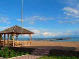 Пирс длиной 105 метров Шезлонги Зонты Бамбуковые беседки на пляже