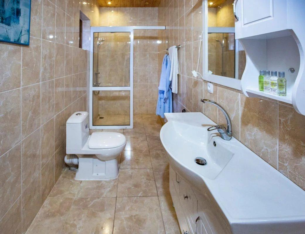 2-х этажная Вилла 3х комнатный номер. Кухня, Зал на первом этаже, две спальни на втором этаже, одна спальня с большой кроватью вторая спальня 3 раздельные кровати, в номере 3- сан. узла, джакузи, душ, туалет, ТВ, спутниковая антенна (18 каналов), DVD, шкаф, кухонный стол, кухонная посуда, кухонный гарнитур, мягкая мебель, стулья, тумба, трюмо, журнальный столик, сушилка, холодильник, эл.чайник, кресло массажор, собственный двор с бамбуковой мебелью и качелей, балкон До пляжа 130 метров