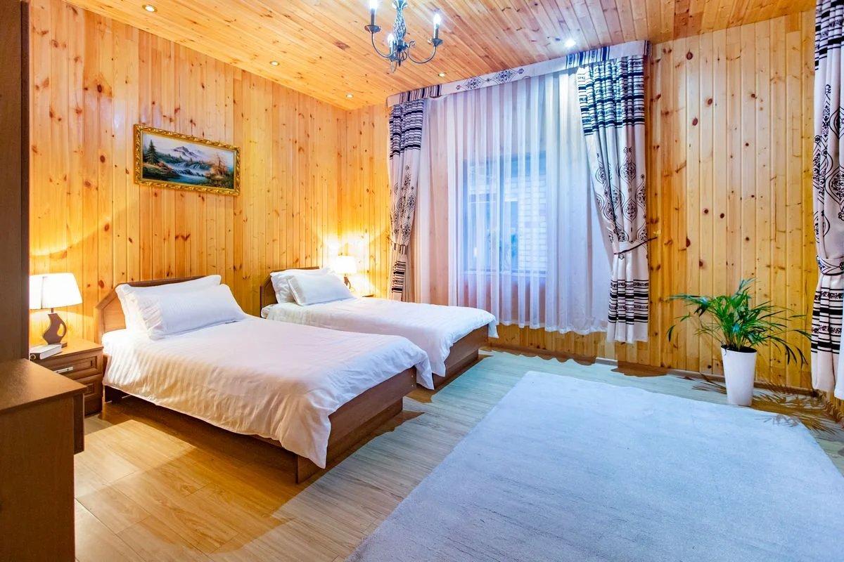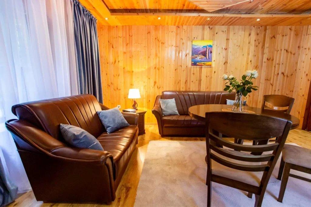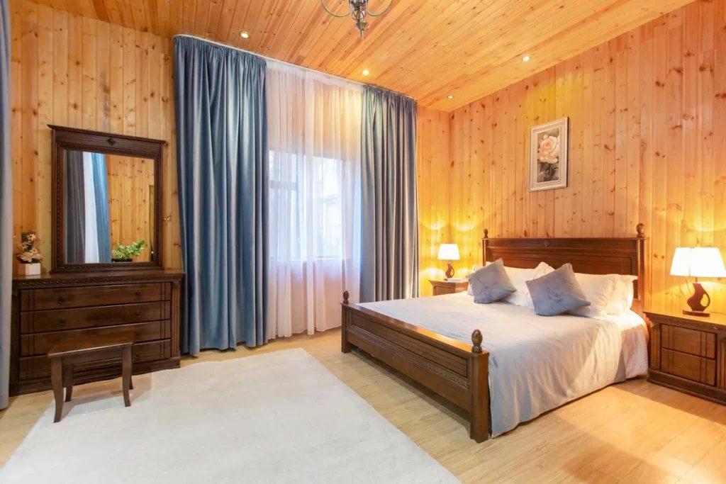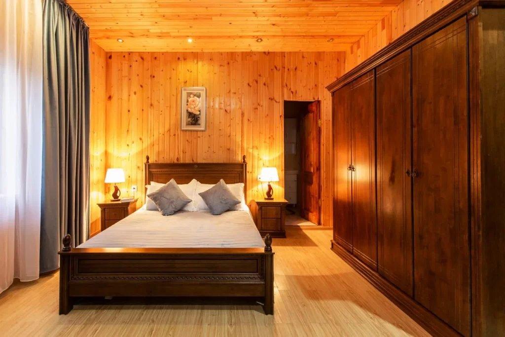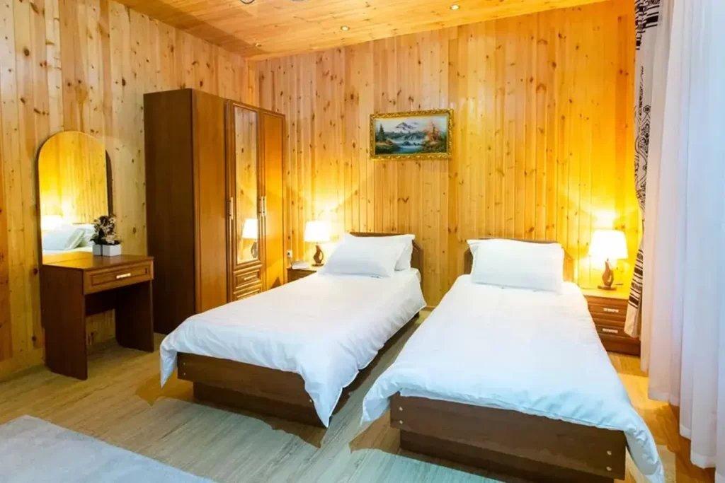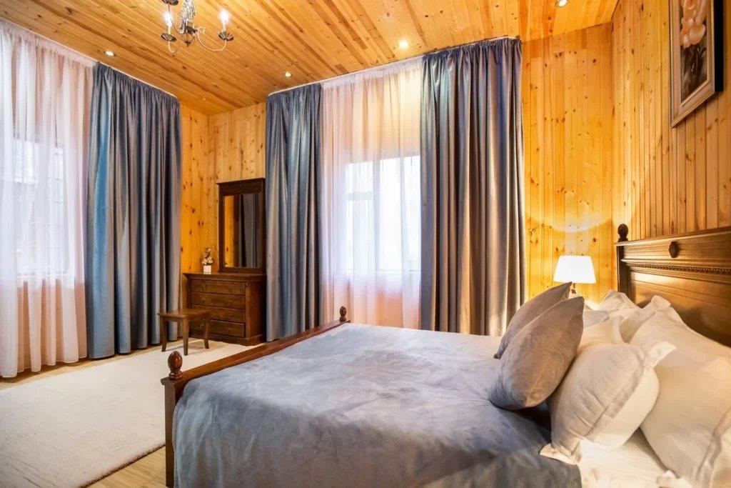 Уютные номера, выполненные в теплых тонах с элементами неоклассики, с видом на сад и на горы.