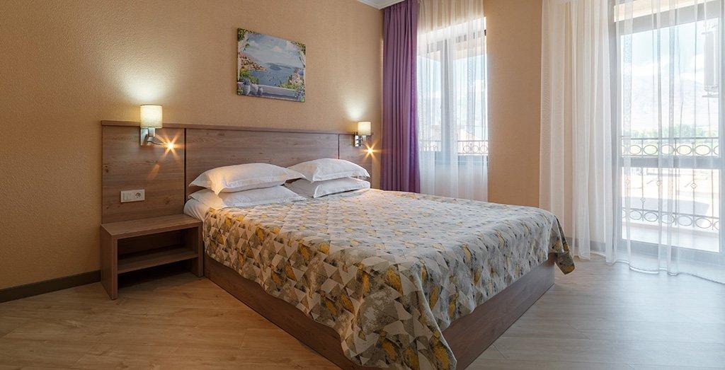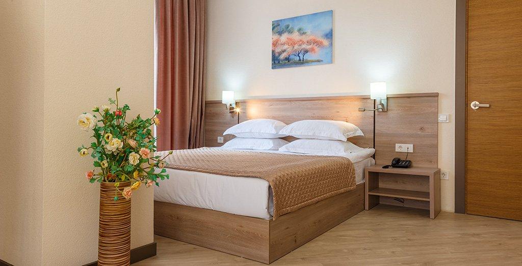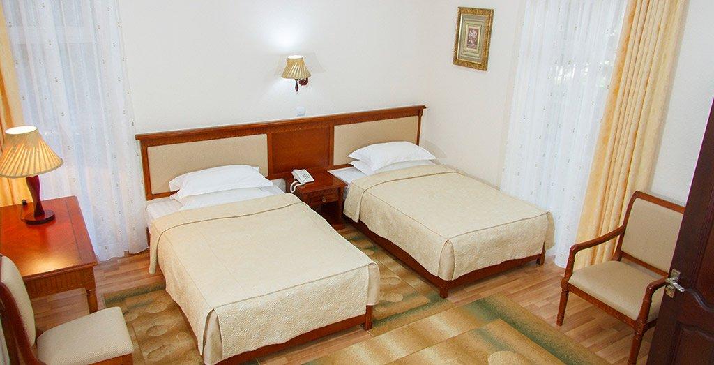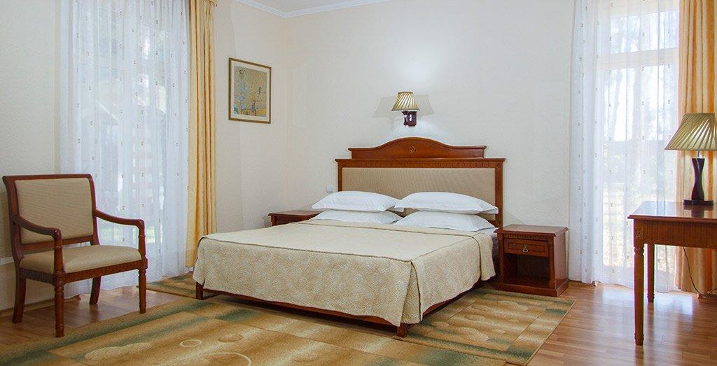 Номера отеля отвечают международным стандартам и оформлены в едином классическом стиле. Преобладающая часть номеров имеет персональный балкон или террасу с плетеной мебелью.
