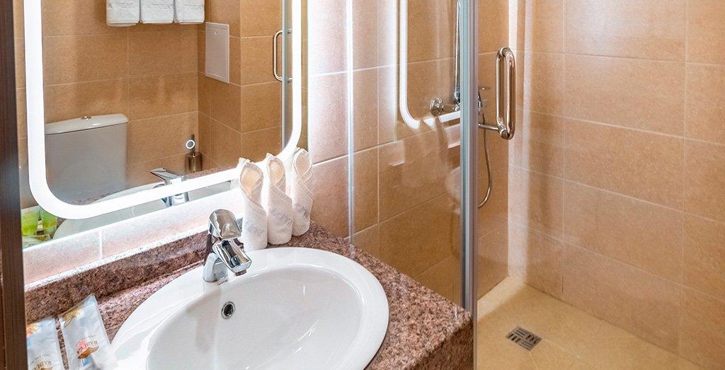санузел и ванная комната спутниковое телевидение телефон чайник и посуда для чаепития фен банные полотенца щетка для одежды, салфетка для обуви, коврик для пляжа, набор для гигиены, зонтик, внутренние и пляжные полотенца